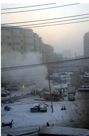 在冰面往南十余米處,宋家灘供熱站的維修人員正打開馬路中間的井蓋修理管道。據(jù)維修人員講,破裂的管道是二三十年前的老供熱管道,因年久失修,于12月23日凌晨破裂。